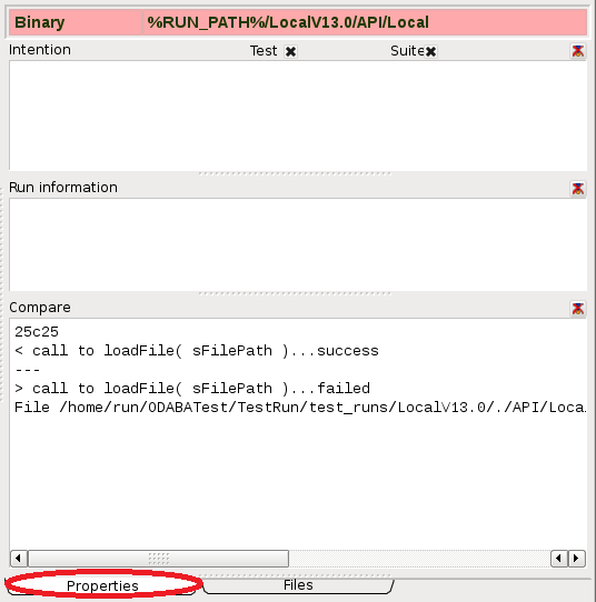 Data shown in the fields is the content of several files stored for the test run entry.Intention: The test intend is taken from the test case and should not be changed here (test). In Run information (TestSummary.txt) one may add special events happened during test. The test result is obtained by comparing expected data and data created by test. Differences detected by calling diff are shown in the Compare area (compare.out).