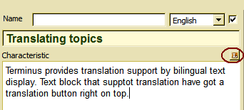 Terminus provides translation support by bilingual text display. Text block that support translation have got a translation button right on top.