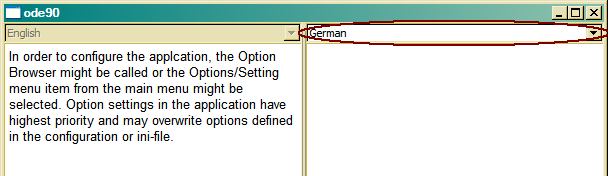 The language selection box in the right pane allows selecting the target language. The left pane is read-only and cannot be changed. When closing the translation window, the translated text is stored under the selected language, which might be selected in the topic's language selection box.