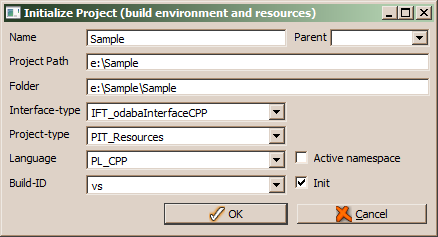 When changing the interface type, the suggested programming language will be selected (e.g. CPP when selecting IFT_odabaInterfaceCPP). One may mix C++ or CSharp (C#) implementations with OSI, i.e. any implementation class in a C++ or C# project may contain mixed function implementations. One may, however, not mix C++ and C# within a project. For C# projects, vs (Microsoft visual studio) should be selected as build environment (Build-ID). C++ projects may choose between vs, gcc (GNU compiler). When you are going to use the ODABA build environment (obe), obe should be selected. One also may define any other environment (see Build Support).