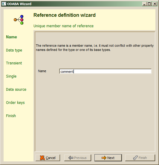 Reference names have to be unique within the members defined for a data type and its base types. Reference names are technical names and must not contain special characters or spaces except underscores. When the reference name is not correct or has already defined as member for the data type or one of its base types, an error will be displayed in the wizard's message area after pressing the Next button.
