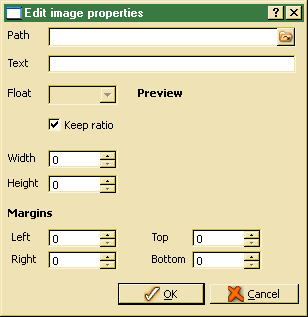 The action allows inserting an image into the text. The image has to be stored as file in an external folder. In order to change image layout options, one may be call the action (pressing the action button) after selecting the image in the text box. After clicking the action button The image dialog pops up: