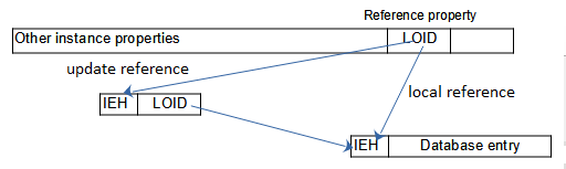 In case of creating a local reference the new LOID for the created database entry is stored directly in the referencing object instance causing an instance modification. In case of an update reference a LOID will be reserved already when creating the object instance. When assigning or creating the referenced instance, an intermediate database entry is created for the LOID in the reference property, which only contains the LOID to the assigned instance. The database entry contains the referenced instance data.