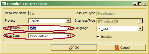 A default class name has bee created from the resource name prefixed by the option set in Options.Implementation.Naming.TypeContextClassPrefix. One may change the name or assign an existing context class from the drop list. The default base class is the system context class defined for the resource type (typically TypeContext or PropertyContext). but an alternative context class might be selected from the drop list.
