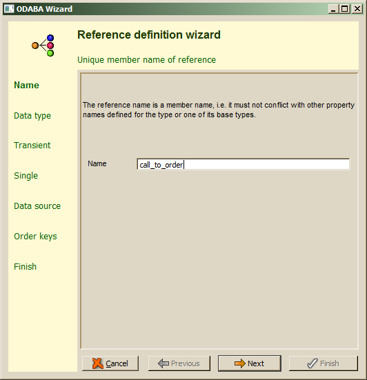 Reference names have to be unique within the members defined for a data type and its base types. Reference names are technical names and must not contain special characters or spaces except underscores. After filling in the reference name, Next should be pressed in order to continue. When the reference name is not correct or has already defined as member for the data type or one of its base types, an error will be displayed in the wizard's message area.