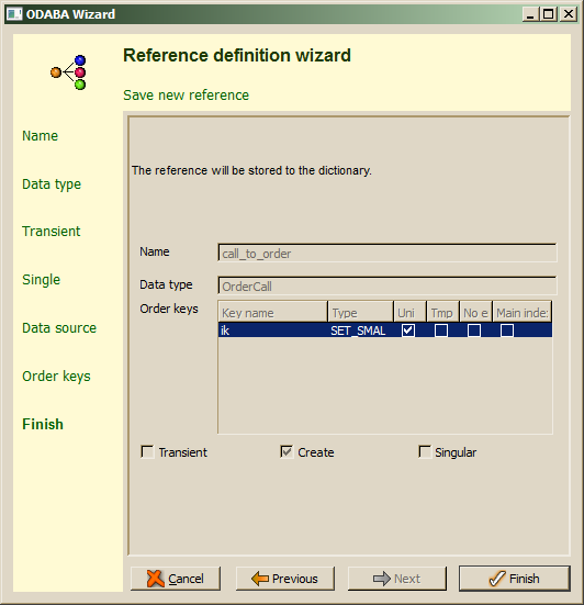 In case that the maximum number of instances in a multiple reference collection has to be limited, the collection size (dimension) has to be updated. When a multiple reference has been defined, the Next step allows defining access keys (sort orders) for the collection.