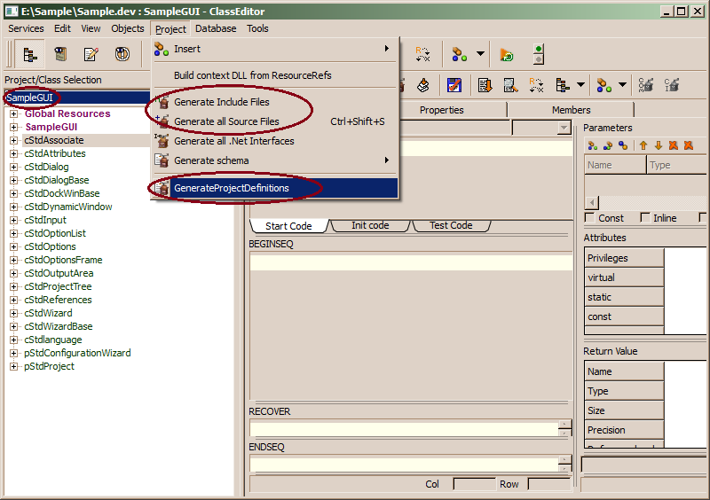 Normally, source code and header files have already been created in Sample/SampleGUI/qlib and Sample/SampleGUI/h. When this is not the case, one may generate sources and header files by clicking the appropriate menu items.