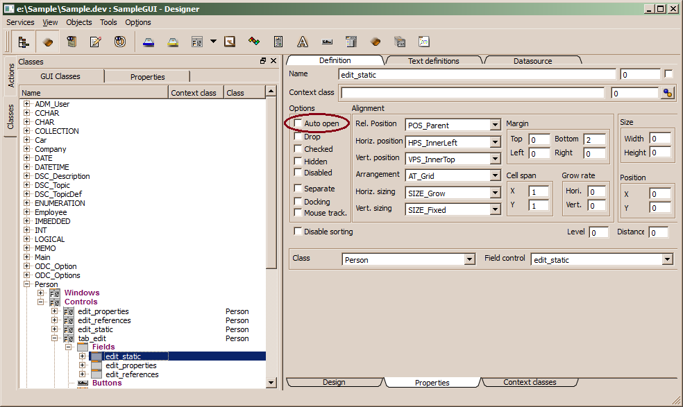 In order to disable elements (e.g. the edit_static control in the tab_edit control, you only need to switch off the Auto-open option after switching to the Properties view) (see also Standard application elements).