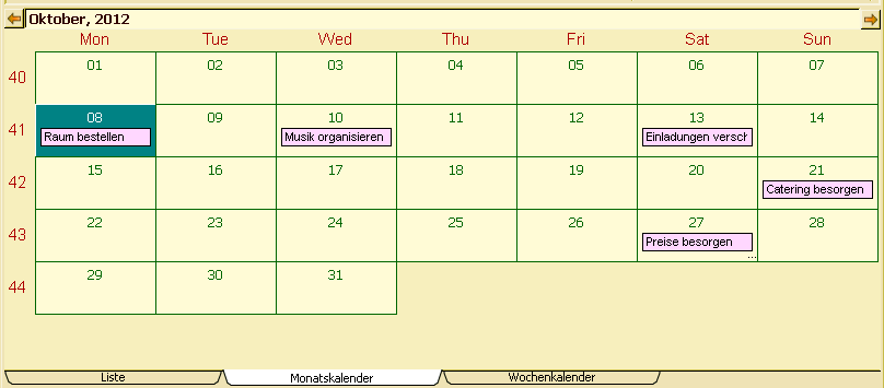 The month calendar control style is a list (collection) control, which displays the days of a month as being provided in the days collection (data source). The month calendar control style is used for managing events by means of a calendar. In contrast to the days calendar, the month calendar provides a better overview, but is not as detailed.