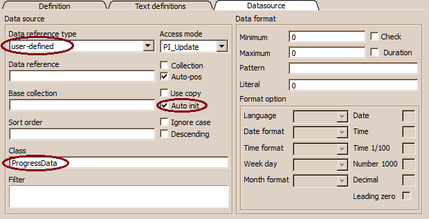 In order to use a progress bar with variable borders and/or variable text to be displayed for the progress bar, a ProgressData instance has to be defined as data source: